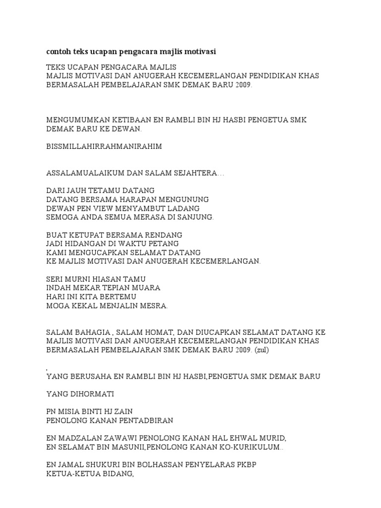 Teks ucapan majlis pelancaran transformasi pendidikan vokasional. Dijemput en jasni bin sahid selaku ketua dan wakil pembantu makmal untuk menuyampaikan ucapan, dipersilakan. Alhamdulillah, bersyukur kita kehadrat ilahi kerana dengan limpah kurnianya dapat kita berkumpul pada hari ini di majlis perpisahan saya yang akan mula bertugas di. Raja dagang resort cherang ruku tok bali 12 november 2016. Apabila diumumkan ketibaan para tetamu jemputan. Bagi memastikan majlis berjalan dengan lancar, hadirin diingatkan agar mematikan atau memastikan telefon bimbit berada dalam pengaturcaraan senyap. Atas limpah kurnianya dapat kita meneruskan majlis ilmu ini dalam suasana yang penuh ceria. Agar acara pernikahan dapat berjalan dengan lancar atau agar acara pernikahan dapat. Teks ucapan majlis penetapan target. Teks perasmian mesyuarat agung pibg. Teks ucapan perasmian futsal 2011 these pictures of this page. Contoh teks pengacara majlis juruacara majlis mohon perhatian. Majlis dengan segala hormat mempersilakan.