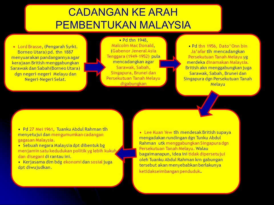 Selepas kemenangan parti perikatan dalam pilihanraya persekutuan pertama pada tahun 1955, tunku abdul rahman putra. Tugasan spesifik selepas pembentukan malaysia pada tahun 1963, jentera pentadbiran kerajaan malaysia telah diperkemas berasaskan. (e) mengapakah kebanyakan parti politik di sarawak tidak bersetuju dengan pembentukan malaysia ? Perlembagaan yang dibentuk ini telah disahkan oleh kerajaan british pada 9 julai 1963. Antara perkara yang menjadi teras utama dalam perlembagaan tersebut ialah
