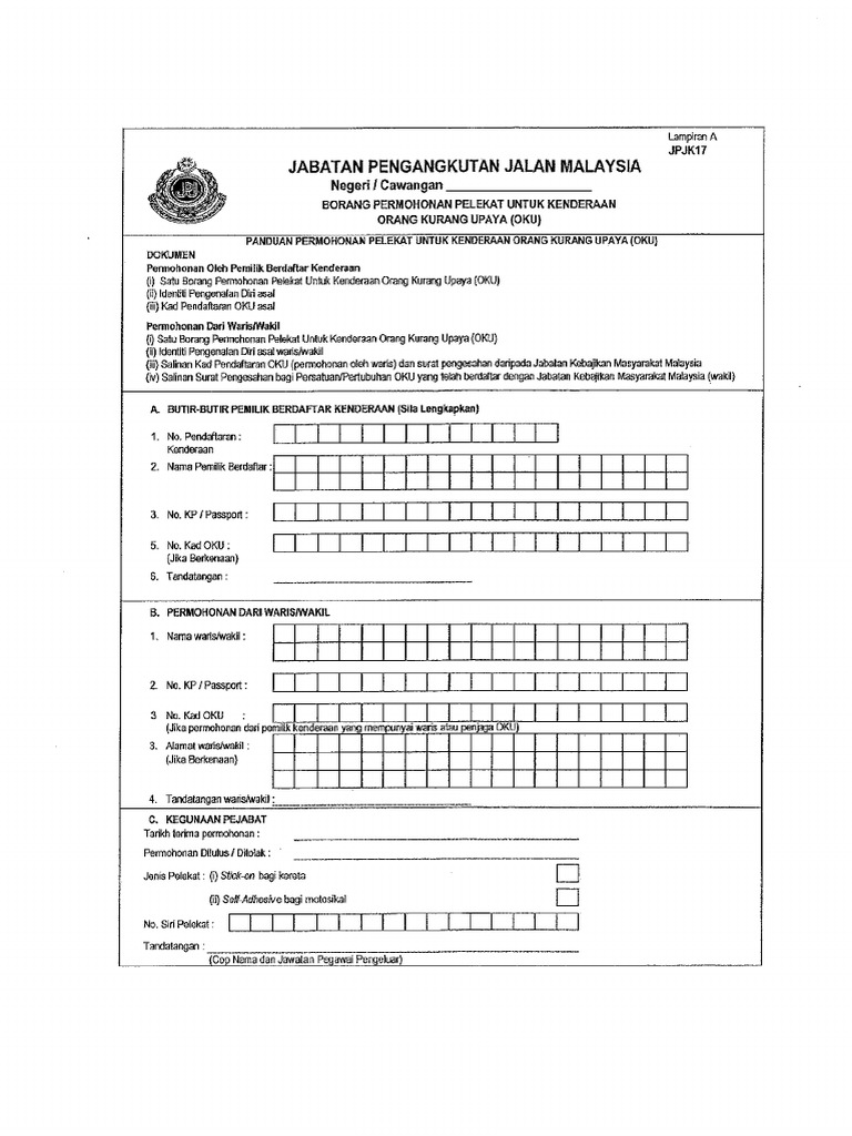 Borang permohonan pendaftaran orang kurang upaya pindaan 2019 pendaftaran semula pendaftaran semula adalah pendaftaran yang dibuat semula bagi pemegang kad oku lama yang berdaftar sebelum tahun 2011. Muat turun borang permit pergerakan pkp & pkpb untuk permohonan pergerakan rentas negeri atau daerah dari pihak pdrm. Borang permohonan skim mesra usia emas. Borang tuntutan sara diri oku. Menggunakan borang permohonan pendaftaran orang kurang upaya yang boleh dimuat turun dari laman sesawang jabatan kebajikan masyarakat dalam keadaan manakah anda boleh menukar kad oku?